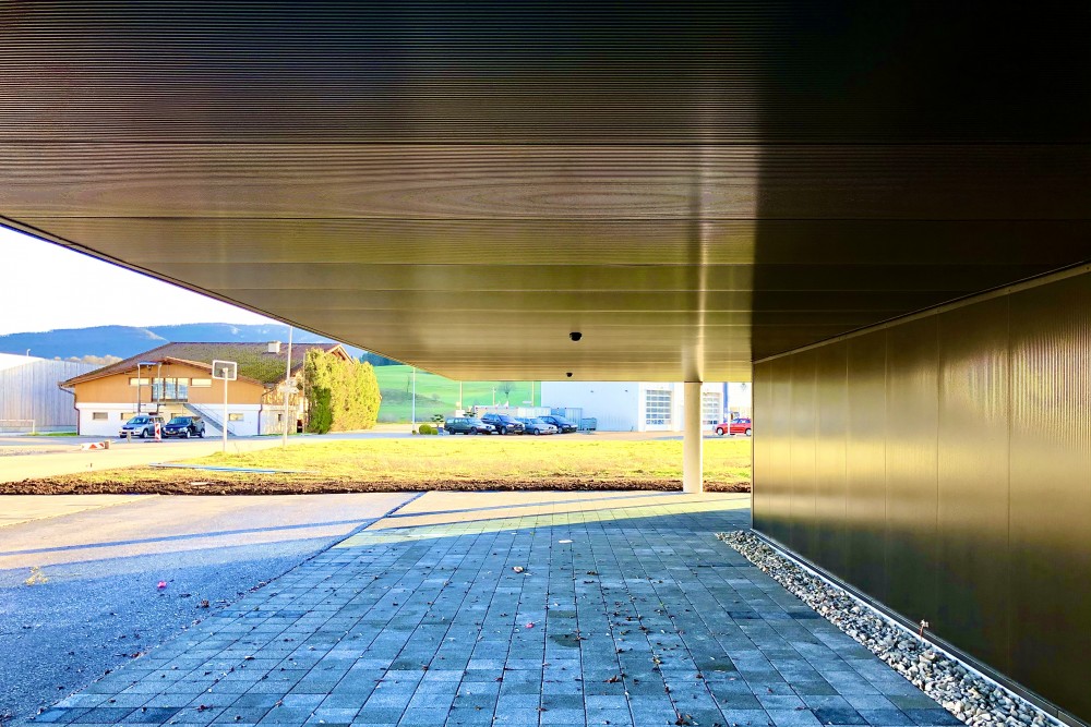 l’ensemble est traité de manière simple, économique et rationnelle avec des matériaux, des revêtements et autres éléments découlant directement de la production courante. les façades sont en panneaux sandwich de couleur gris foncé comme la précédente usine construite sur ce site. on joue ainsi avec la même esthétique mais en soulignant l’entrée par un porte-à-faux. Celui-ci permet de terminer l’aménagement de cet ensemble de parcelles avec un geste fort.