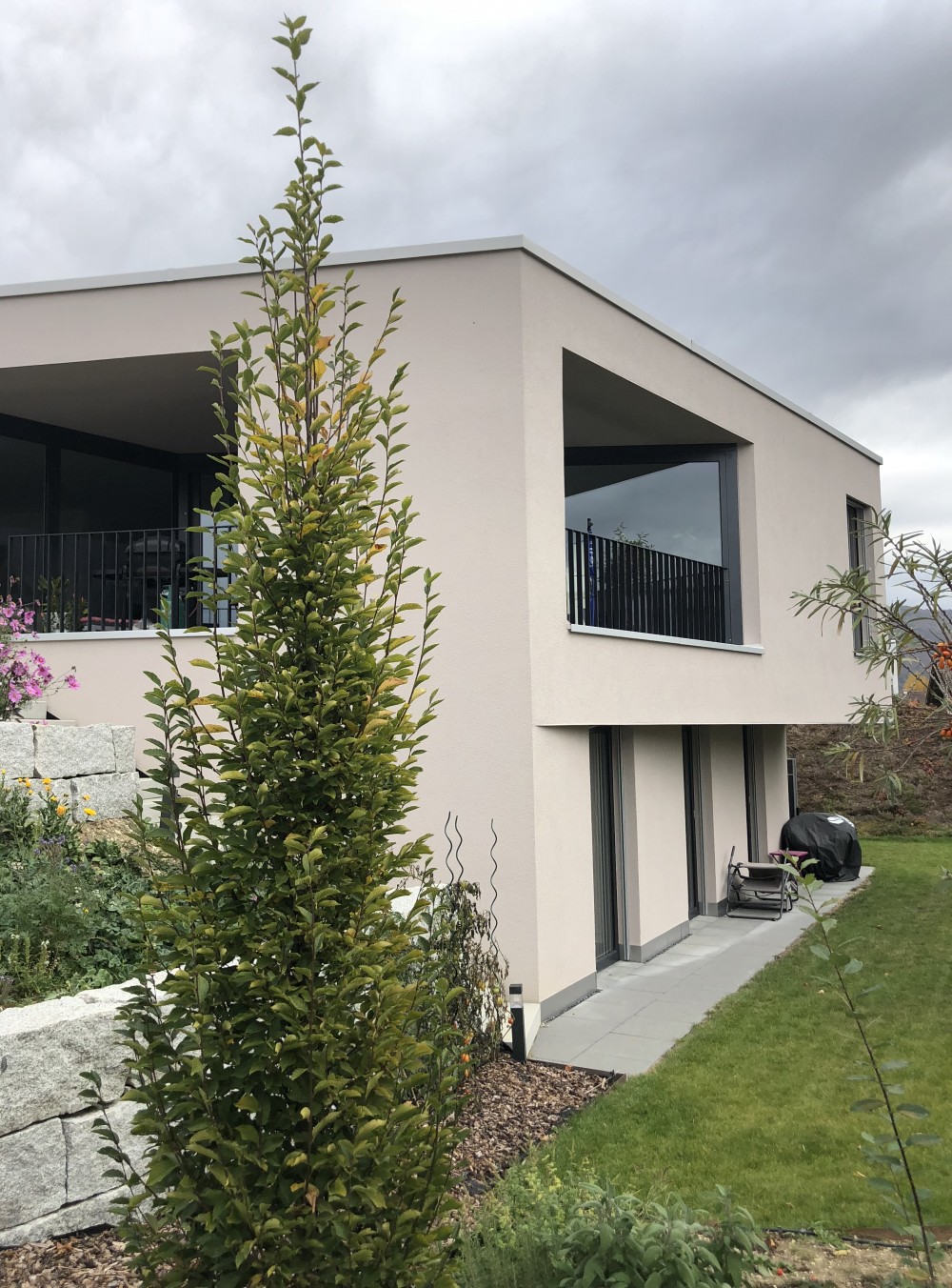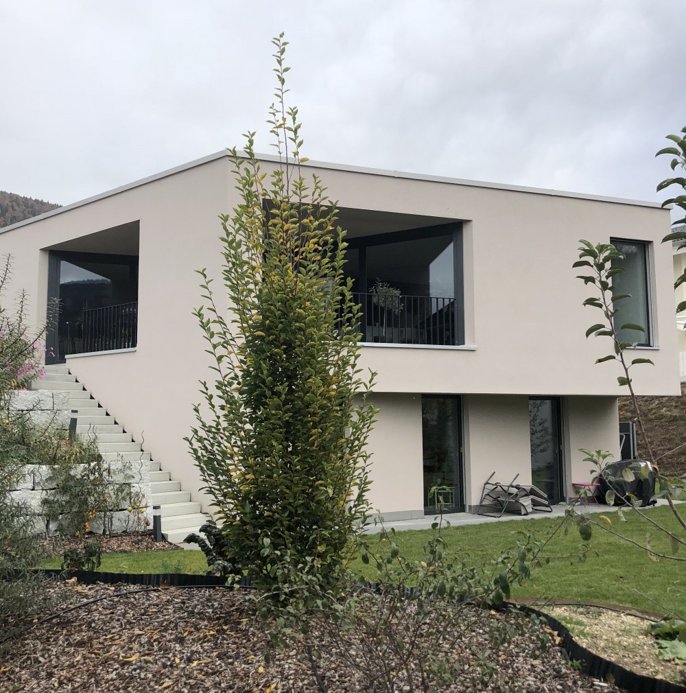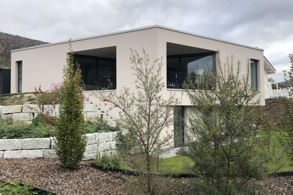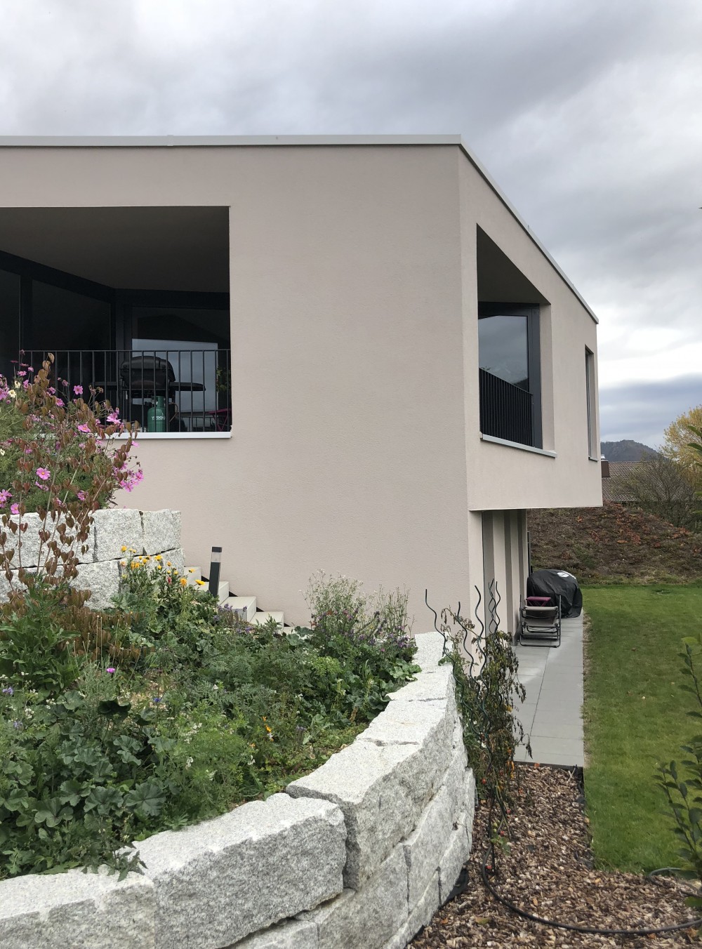 les façades sont crépies couleur gris-taupe de manière à minimiser l'impact du volume et s'intégrer le plus naturellement possible dans l'environnement.