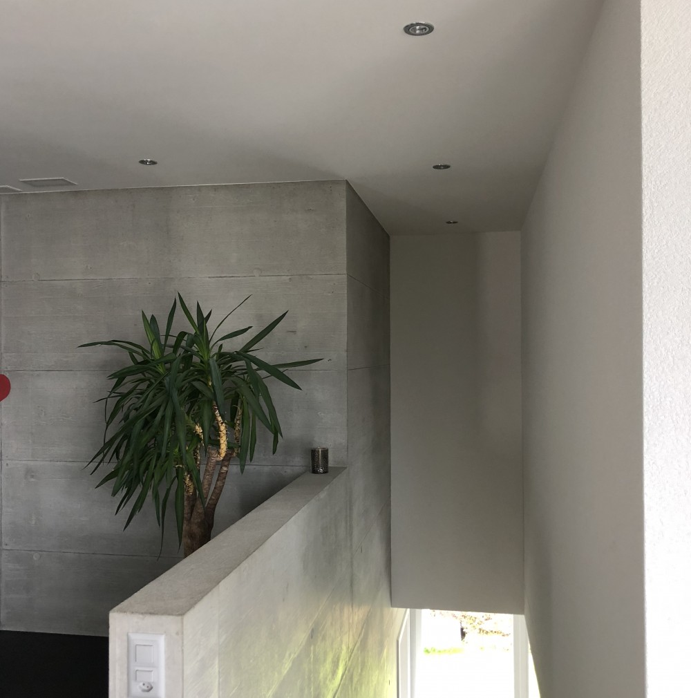 avec sa toiture plate et son aspect monolithique, la villa semble avoir été creusée par endroit pour définir des espaces extérieurs. ainsi, côté route, nous créons un abri pour les voitures qui protège également l'entrée. au sud-ouest, la terrasse couverte est taillée de telle façon qu'elle permet de cadrer les vues les plus dégagées sur le paysage et de conserver l'intimité de la maison vis-à-vis des voisins. ce premier niveau dévolu au séjour, salle à manger, cuisine, s'articule autour de l'escalier. celui-ci amène au niveau inférieur qui est réservé aux chambres, largement ouvertes sur le jardin et aux locaux techniques enterrés.