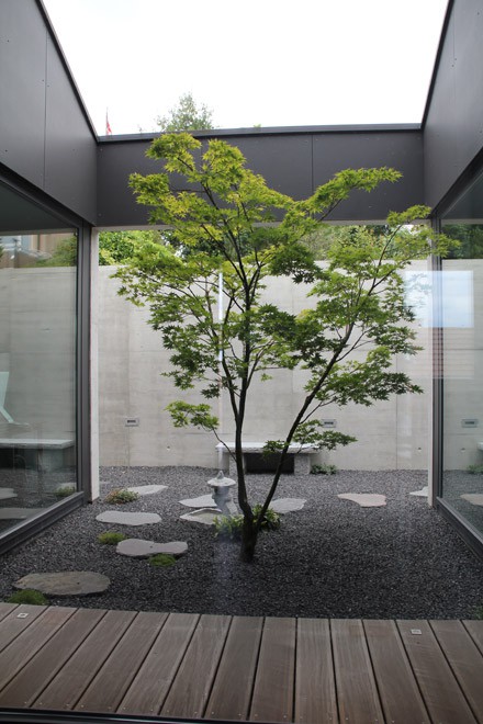 le volume du bas est traité comme socle, grâce à l'utilisation d'un revêtement en aluminium thermolaqué anthracite, la plate-forme est quant à elle recouverte d'un deck en bois et délimitée par des barrières ou des murs en béton visible. le niveau supérieur découpé en plan retrouve une unité volumétrique en façade et se décline sous la forme d'un toit asymétrique à deux pans.