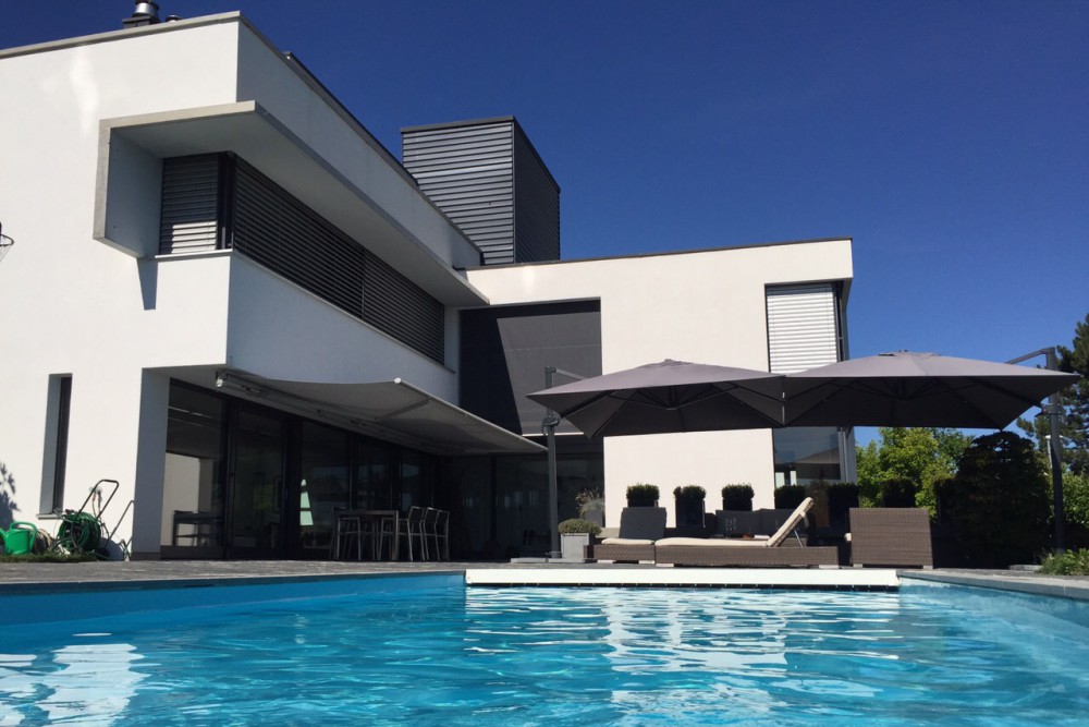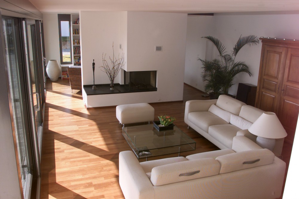lumineuse, transparente, repliée sur elle-même de par sa forme et sa terrasse en demi-atrium mais ouverte sur les paysages environnants et le jardin aménagé, il n'est pas donné l'impression de se sentir observé malgré la générosité des surfaces vitrées.