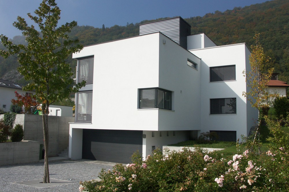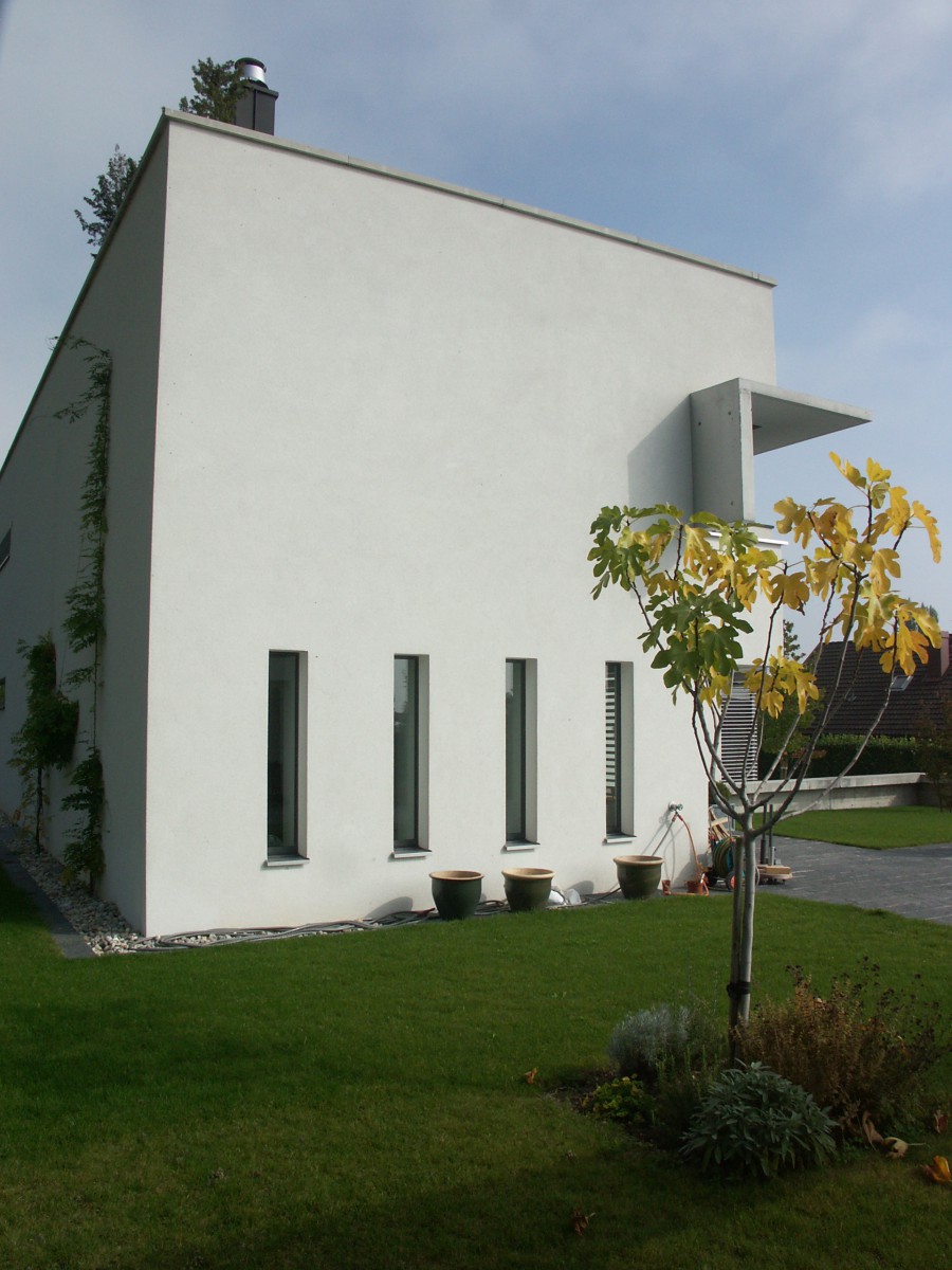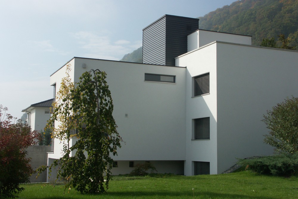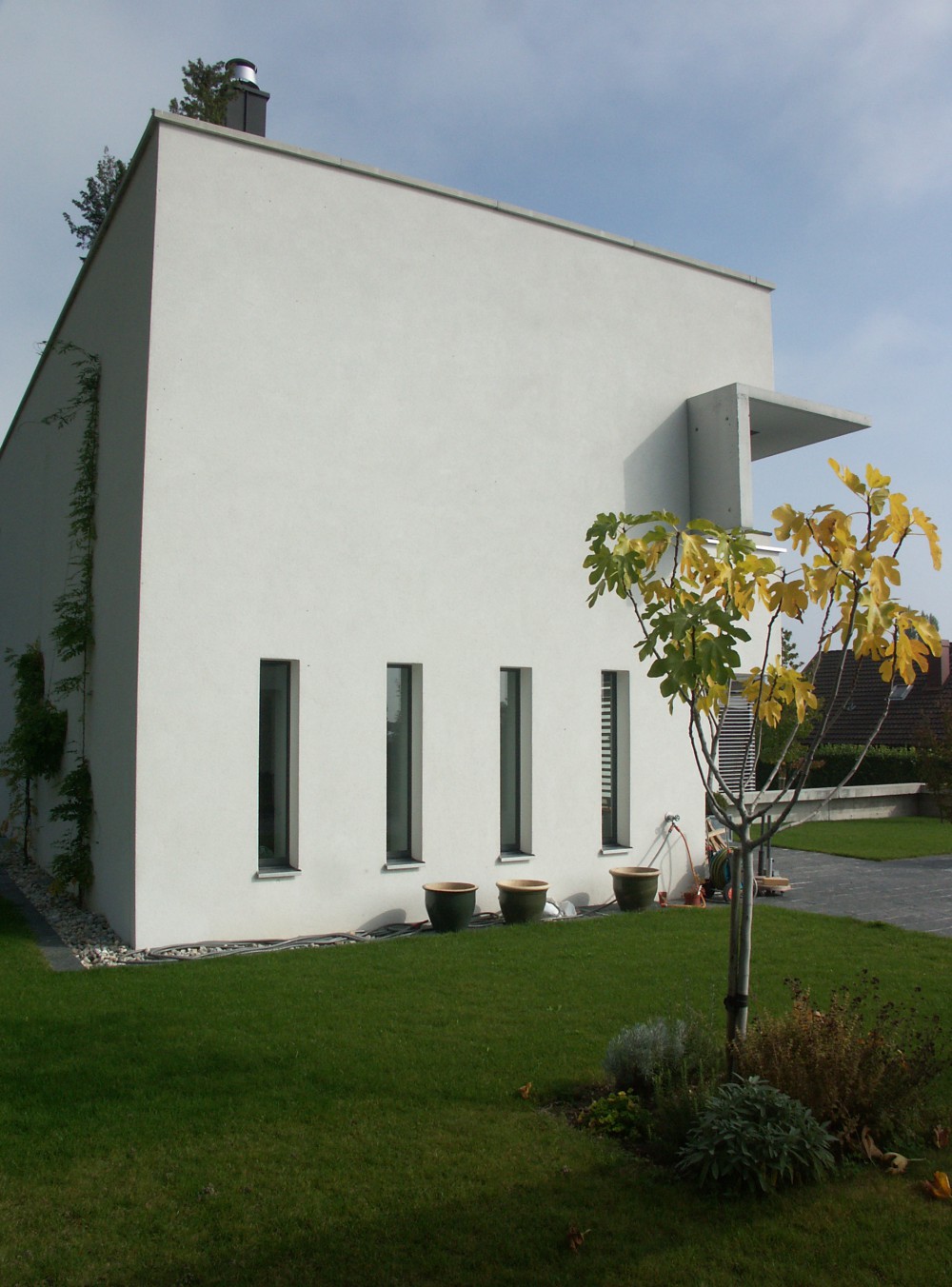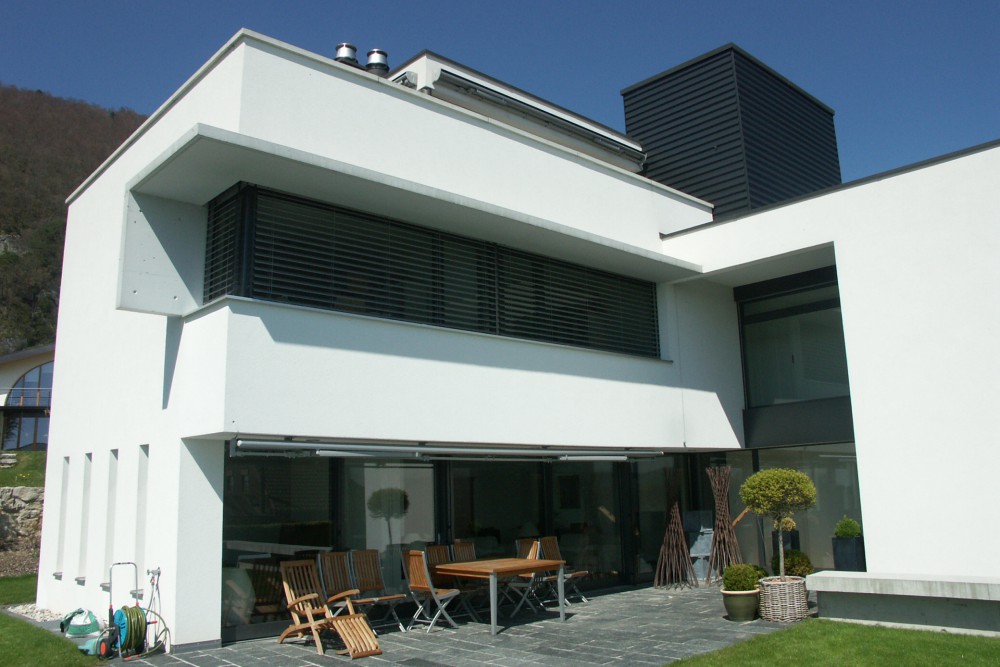 située sur une grande parcelle à faible déclivité dans les anciens vignobles de la neuveville, la villa est intégrée au site avec un jeu de murs de soutiens qui donne une assise horizontale à l'ensemble, délimite les espaces extérieurs, structure le jardin et protège des regards depuis la route d'accès qui est un chemin de vignoble couru par les marcheurs.