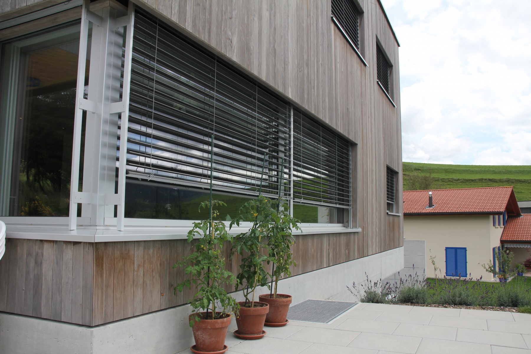 la construction est entièrement en bois, mis à part le radier et les murs de pourtour du sous-sol, atteignant ainsi de par les matériaux mis en oeuvre et les épaisseurs d'isolation utilisées un label Minergie ECO. les murs de façades sont des éléments sandwichs de 50cm d'épaisseur avec 36cm d'isolation et la toiture est isolée avec 28cm de laine minérale complétée de 12cm de verre cellulaire. les façades sont revêtues de lames de sapin pré patiné gris verticales, alors que socle reste en béton visible.