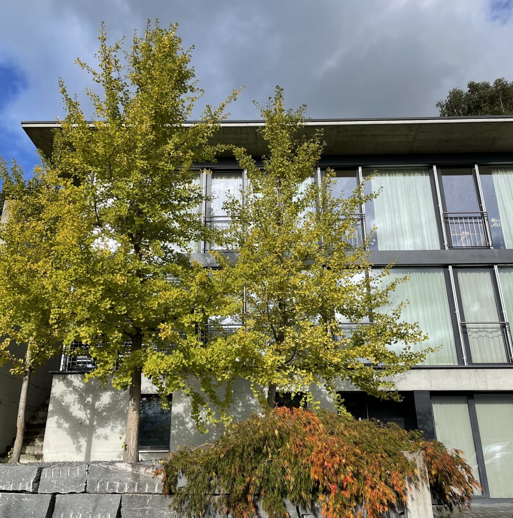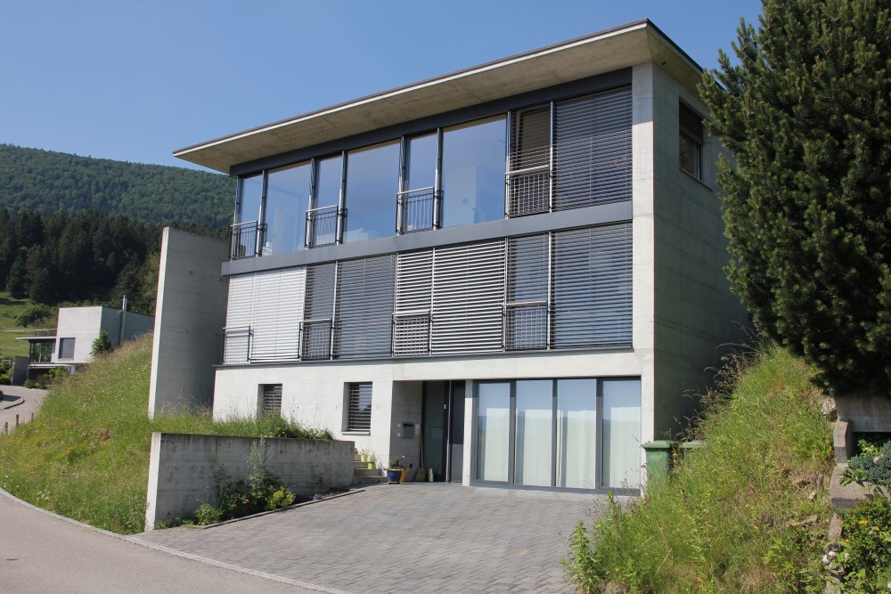 le terrain particulièrement pentu mais bien orienté a déterminé dès le départ le positionnement de la villa ainsi que son concept. le maître d'ouvrage, en raison du dégagement visuel généreux offert depuis cette parcelle sur toute la vallée, a souhaité une maison essentiellement vitrée afin que tous les espaces de vie ainsi que les chambres soient en communion visuelle constante avec le temps qu'il fait à l'extérieur.