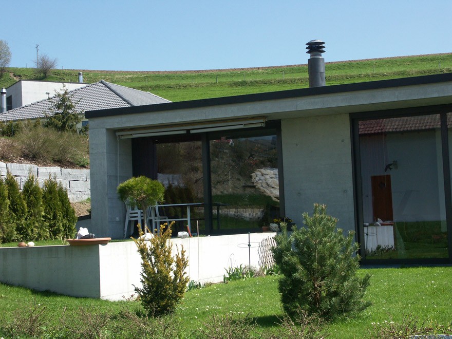 située dans une extension de lotissement au nord du village, la parcelle a été retenue pour son accès par le bas et pour sa situation avec un environnement sud connu. le bâtiment est implanté parallèlement à la route et les accès au garage et à la porte d'entrée sont clairement définis. le garage, de par son positionnement comme élément de socle de la construction avec son prolongement comme mur de soutènement, sert d'assise au jardin privatif et aux terrasses aménagées.