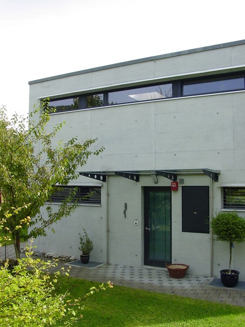 cette construction se veut rationnelle dès le départ. un cube de 9.00 x 9.00 mètres sur trois niveaux permet de structurer de manière claire les fonctions intérieures. une ligne est-ouest délimite également une séparation horizontale de chaque niveau, permettant d'ordonner les fonctions et de rationaliser la technique. cette ligne apporte un élément porteur médian supplémentaire. les ouvertures extérieures sont exclusivement sud pour tous les locaux de vie et nord pour tous les locaux secondaires et de service.