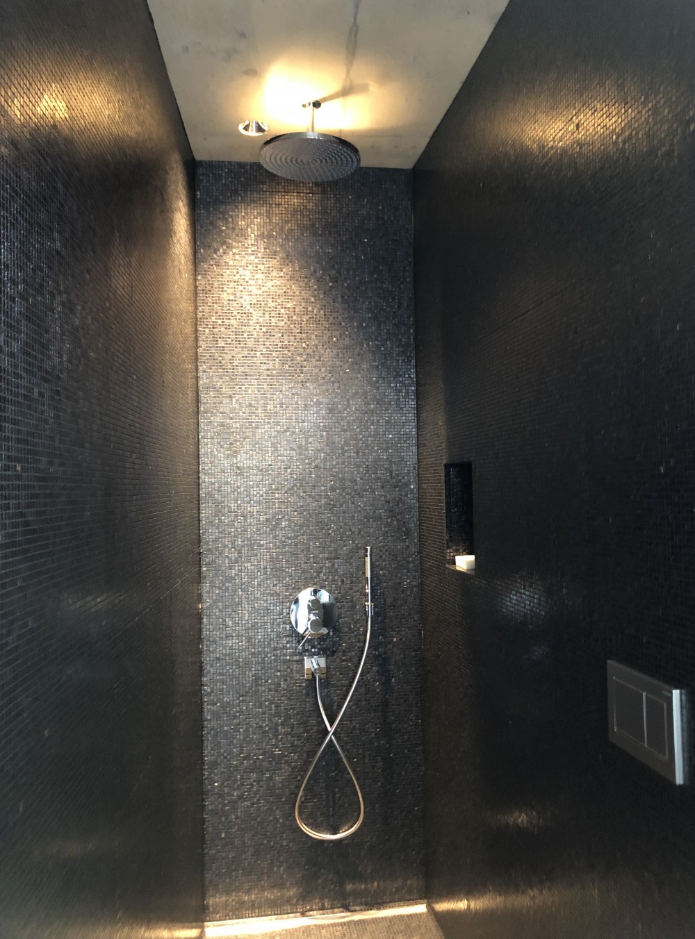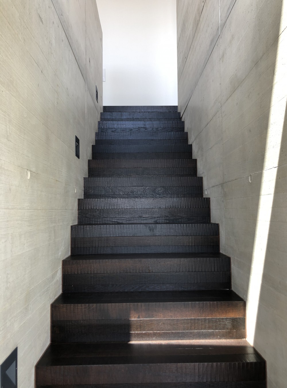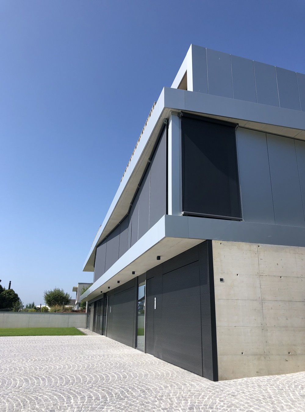 une grande unité et une grande sobriété règnent dans toute la villa. l’aluminium éloxé et/ou thermolaqué des vitrages selon les niveaux, le béton brut des murs intérieurs porteurs et des dalles, le blanc lisse immaculé des cloisons intérieures, les sols uniformes en carreaux de grand format, toutes les parties verticales en menuiserie de chêne fumé brut de sciage ou laquées blanches confèrent à l’ensemble une harmonie totale.