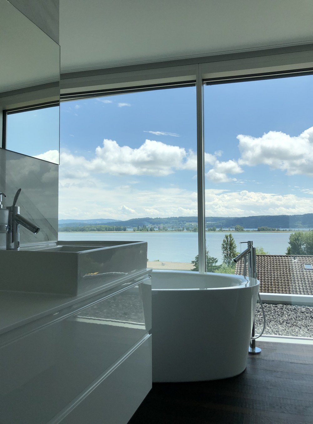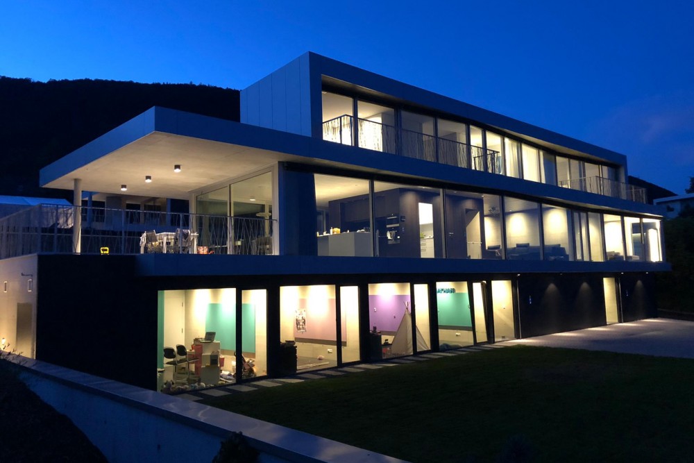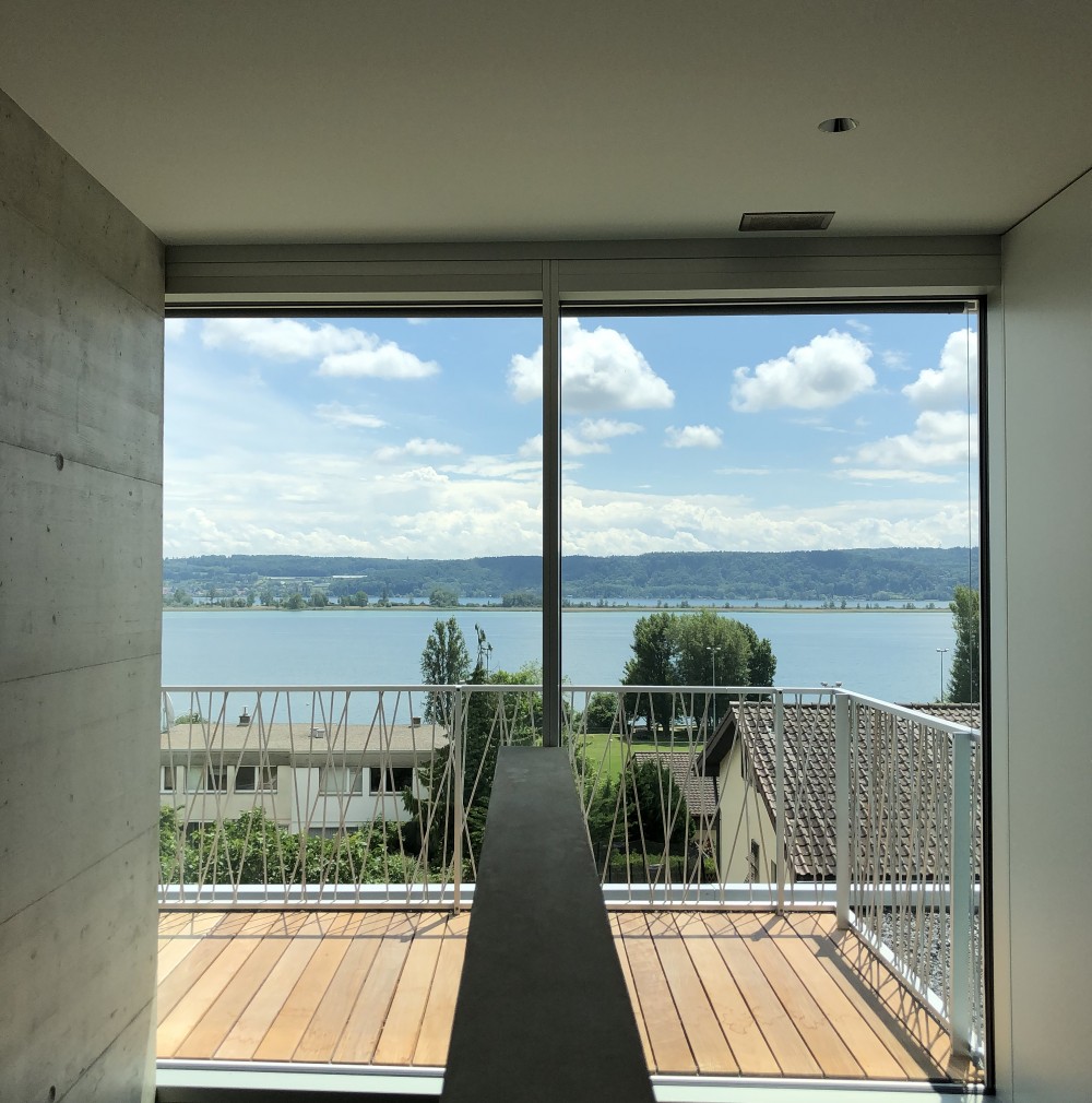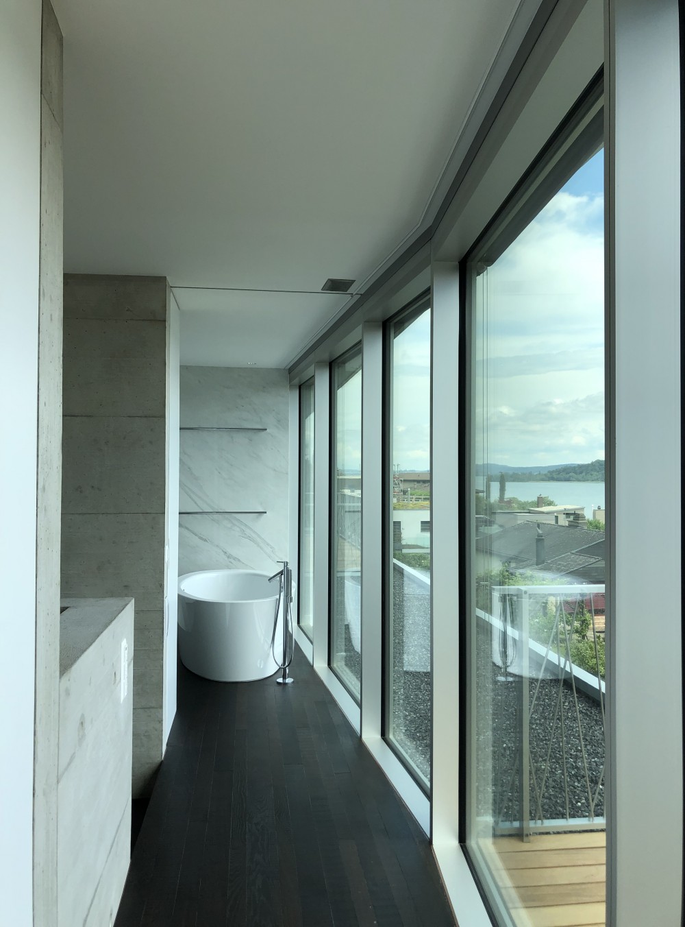 ce niveau est totalement vitré, largement ouvert sur les vues magnifiques en direction du lac, mais aussi sur les espaces aménagés des terrasses et du verger. la maison est conçue sous forme de plateformes, qui mettent en valeur les lignes des différents niveaux. ainsi les baies vitrées de l’étage vie ont été disposées de manière libre ce qui permet de dynamiser les espaces. les éléments porteurs que sont des piliers en béton ronds et rectangulaires aux positionnements ciblés ainsi que le noyau central dans le cube sont alors très discrets et accentue l’impression de flotter dans cet espace cristallin.