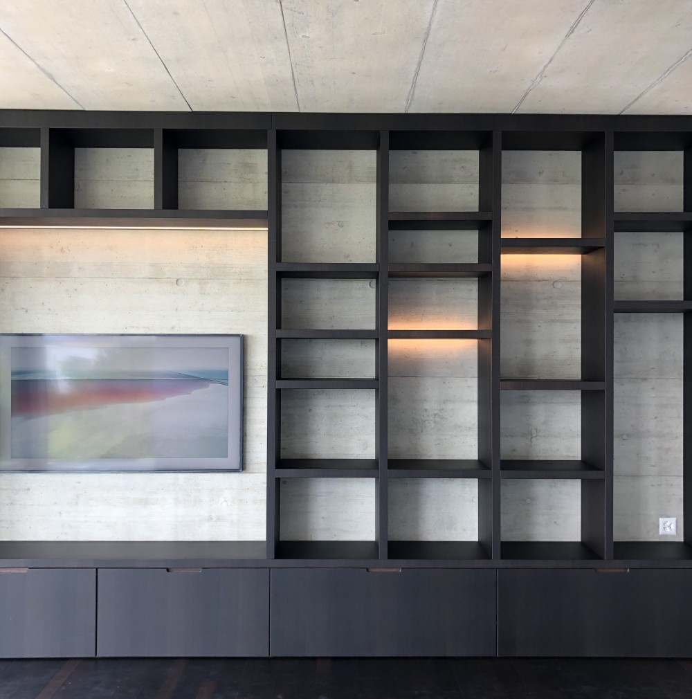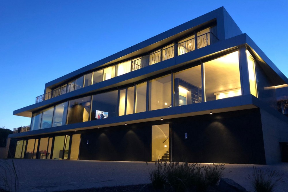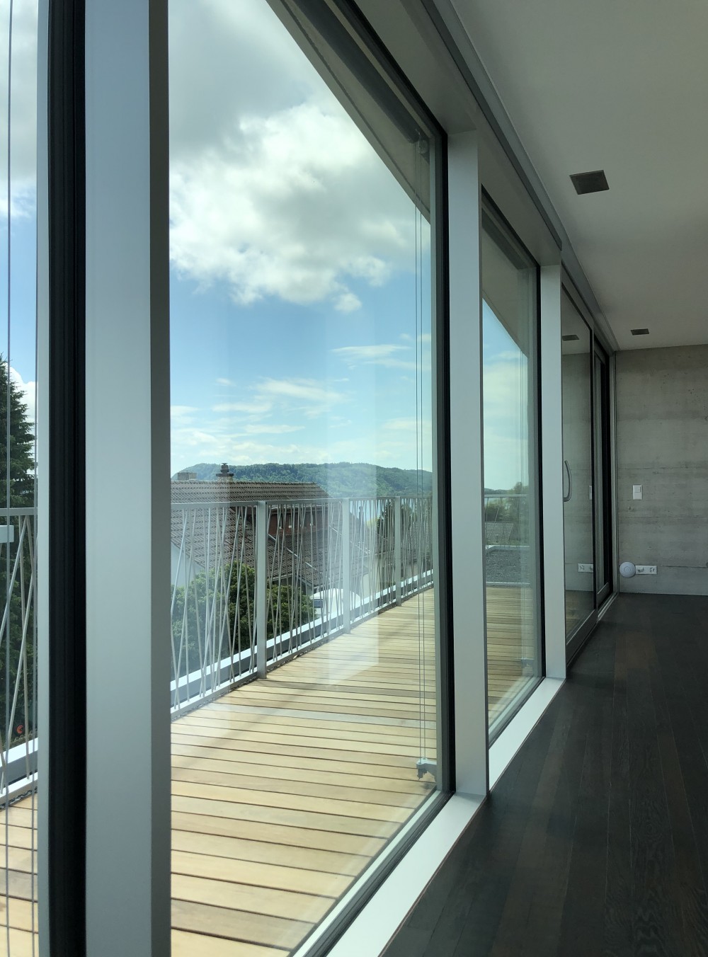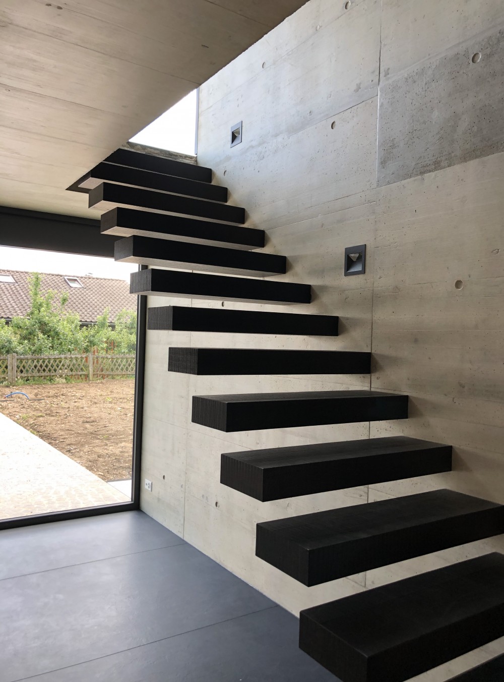 ce niveau est totalement vitré, largement ouvert sur les vues magnifiques en direction du lac, mais aussi sur les espaces aménagés des terrasses et du verger. la maison est conçue sous forme de plateformes, qui mettent en valeur les lignes des différents niveaux. ainsi les baies vitrées de l’étage vie ont été disposées de manière libre ce qui permet de dynamiser les espaces. les éléments porteurs que sont des piliers en béton ronds et rectangulaires aux positionnements ciblés ainsi que le noyau central dans le cube sont alors très discrets et accentue l’impression de flotter dans cet espace cristallin.