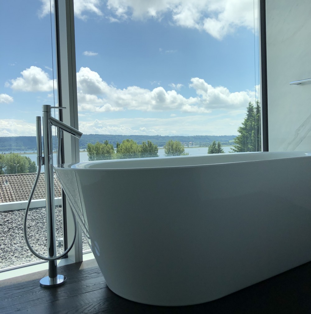 un attique double comprend les suites parentales des deux unités avec zone chambre, dressing et grande salle de bain avec douche, wc, double lavabo et baignoire en pose libre devant la baie vitrée permettant de prendre son bain avec une vue imprenable sur le lac et les alpes au coucher du soleil.