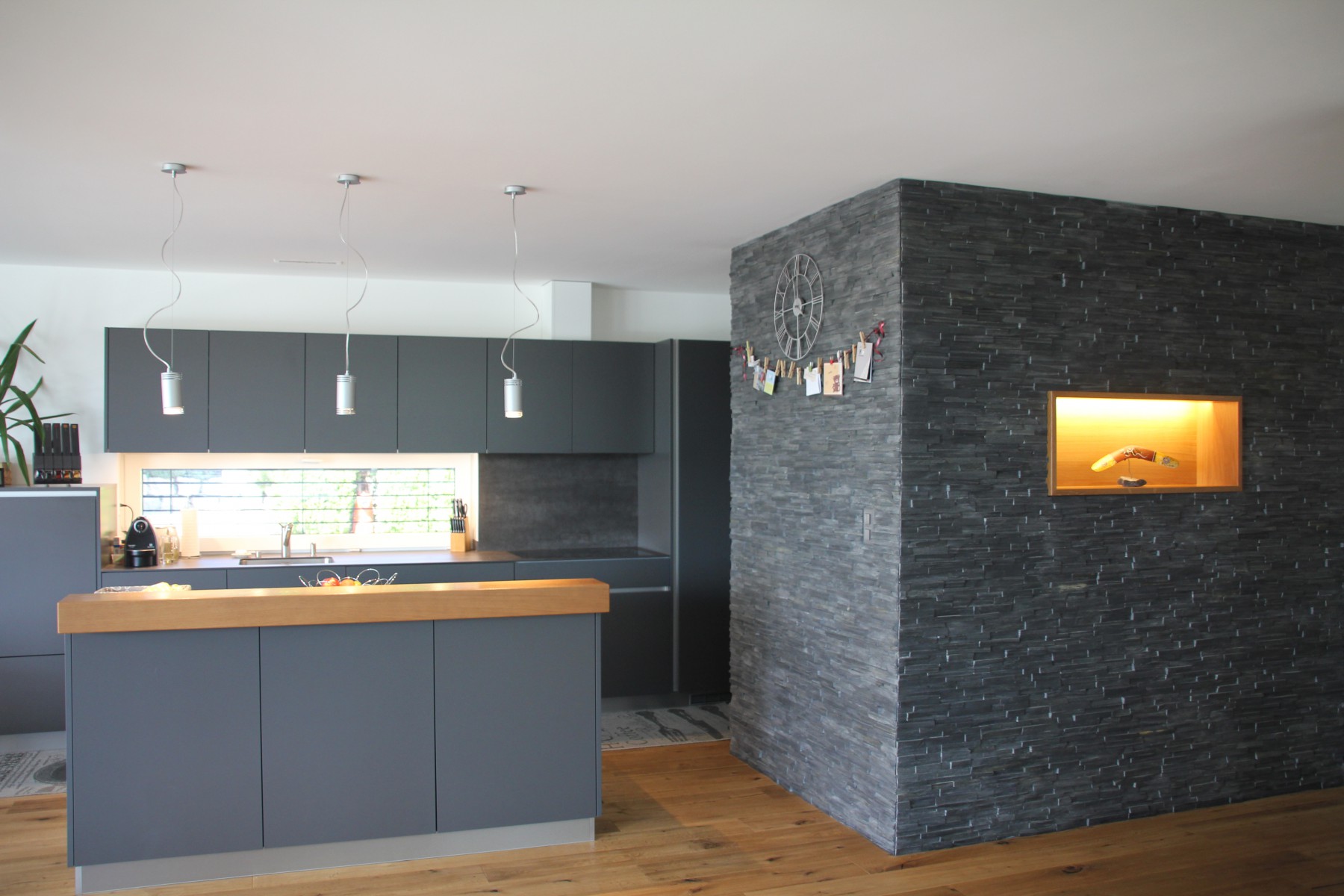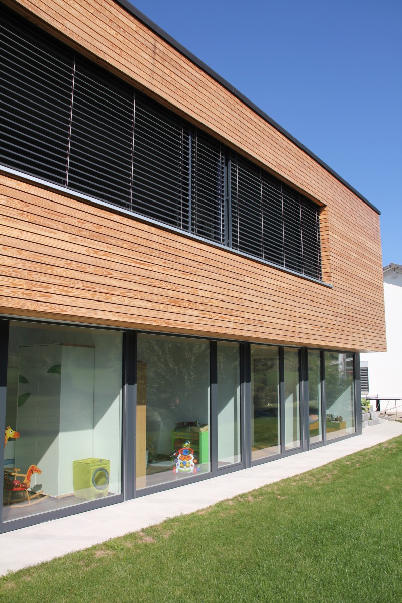 le volume supérieur est traité telle une boîte flottant sur un socle massif. il est matérialisé en lames horizontales de douglas, avec joint ouverts, lui conférant un esprit de dynamisme et de légèreté. le socle est traité en crépi anthracite foncé, l'asseyant dans le terrain. toute l'enveloppe du bâtiment est spécialement soignée afin d'atteindre les valeurs du standard minergie p.