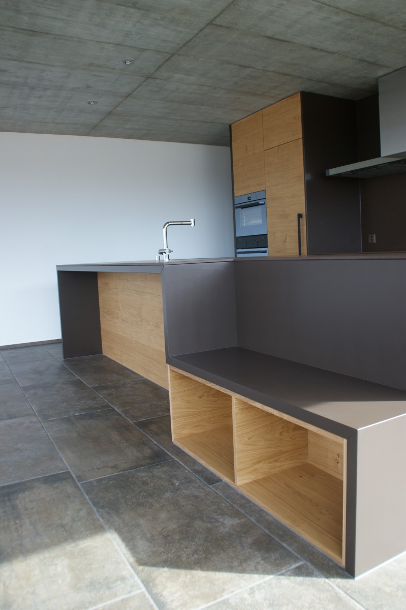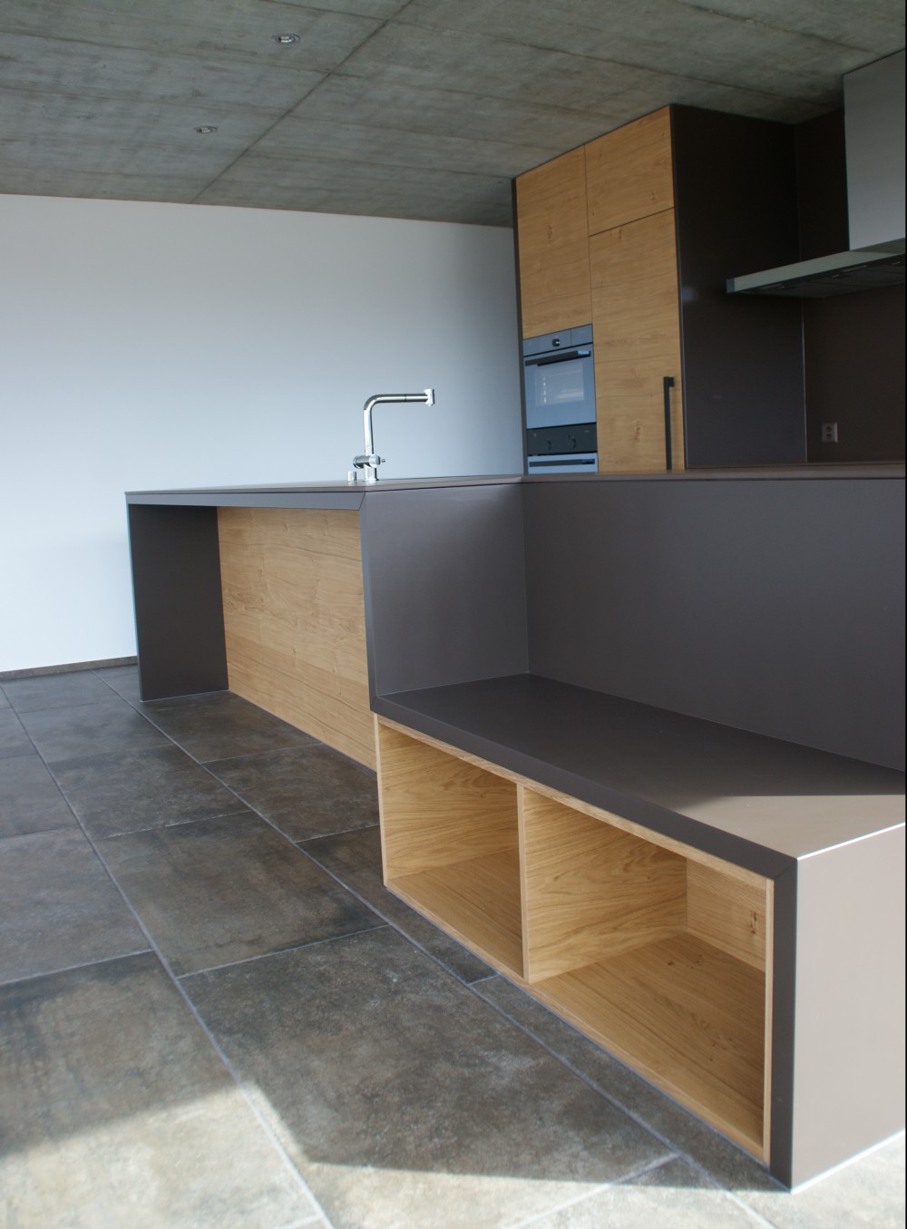 une grande unité et une grande sobriété règnent dans toute la villa. l'aluminium naturel des vitrages, le béton brut des murs et des plafonds, les sols en bois et toutes les parties verticales en menuiserie giclée donnent à l'ensemble une harmonie totale.