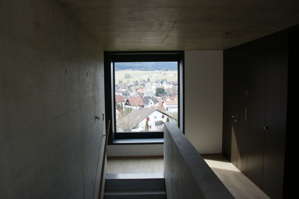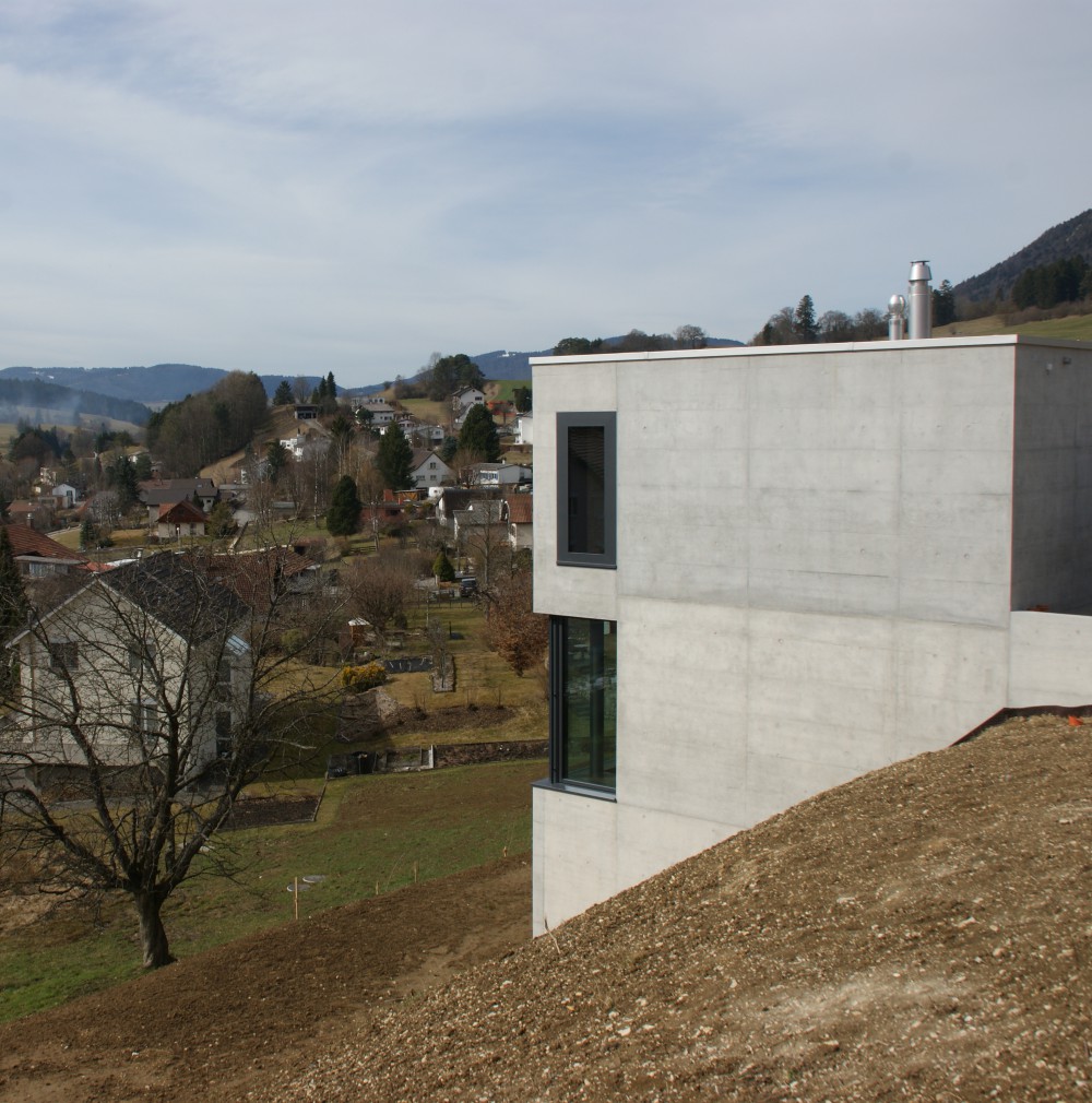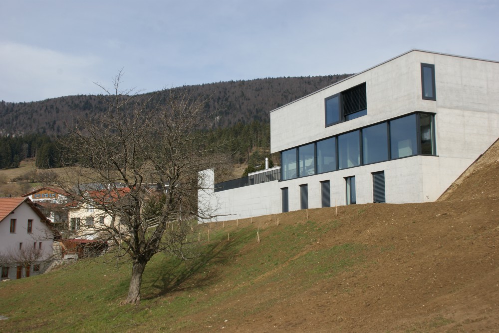 dans les hauteurs du village de malleray sur la commune de valbirse, la villa se positionne dans un terrain très pentu en aval de la route de desserte. le terrain est composé de deux parcelles, dont l'une triangulaire. la parcelle est avant la construction plantée de grands massifs d'essences régionales comme les pruniers sauvages, épines noires, poiriers et autres qui sont un immense refuge pour les oiseaux.
