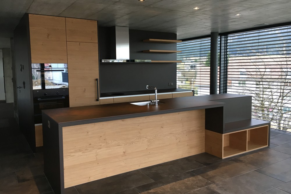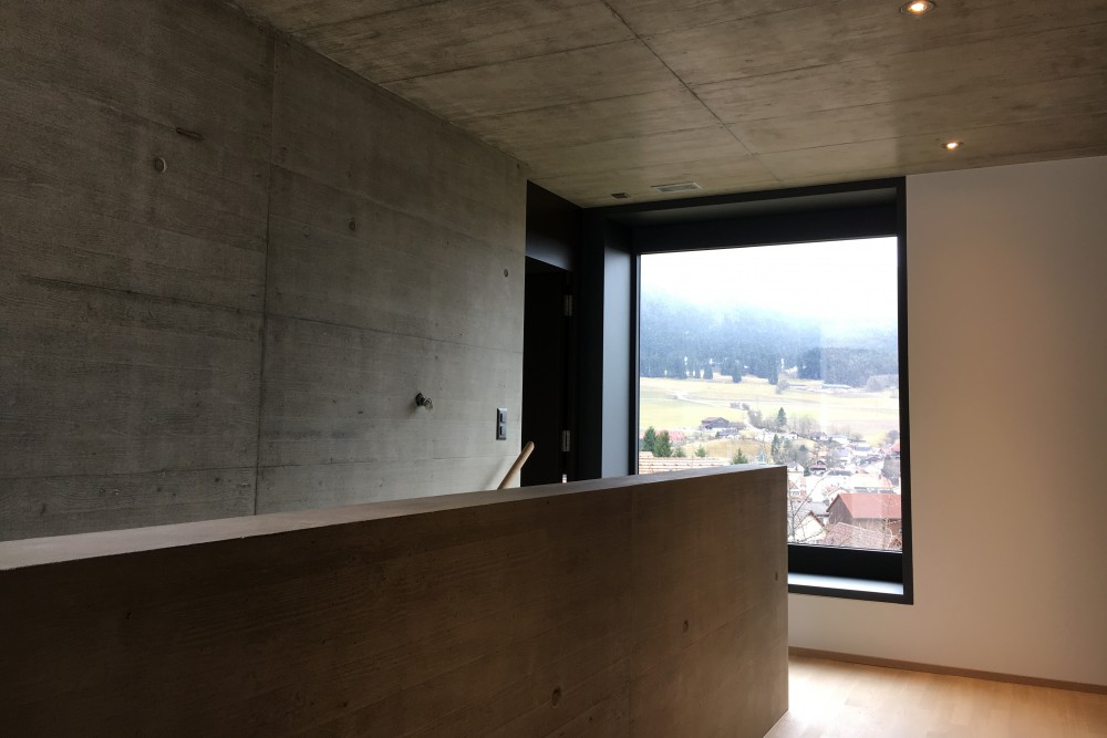 la façade d'accès sur la route est traitée entièrement en revêtement anthracite au niveau de l'entrée et du garage. la partie médiane, celle des espaces de vie, est très vitrée et largement ouverte sur la vue, le village et la vallée. tandis que la partie inférieure avec ses ouvertures ponctuelles offrent un aspect plus massif de stabilité de la construction qui s'ancre dans le terrain.