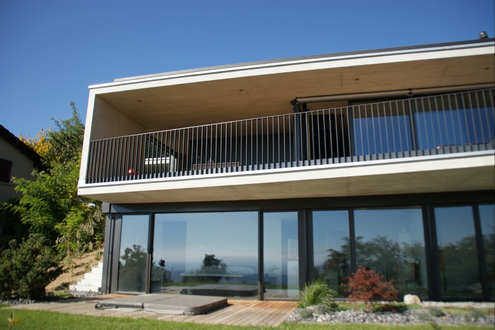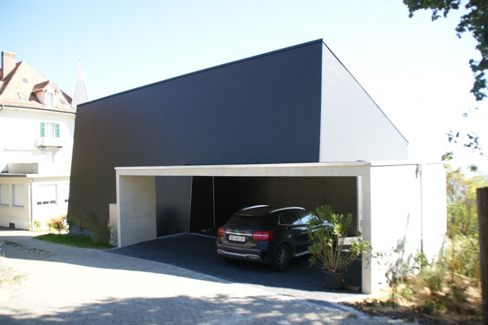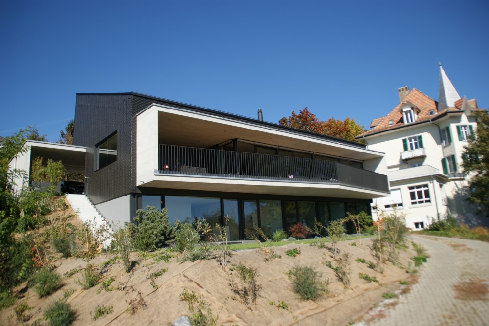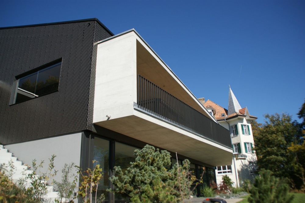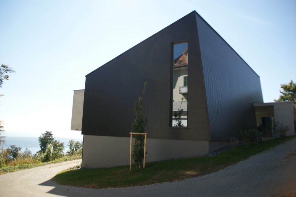 les façades sont traitées en petites ardoises de type eternit de couleur brun-anthracite, de même que le pan nord à forte déclivité. l'élément balcon-terrasse sud en forme de cadre et reprenant les biais des bâtiments voisins est lui traité en béton visible. la forme de la toiture découle des bâtiments longeant la route de la neuveville dans sa partie plus avale, à savoir un pan nord très pentu et s'abaissant jusqu'au terrain, et un pan sud à faible déclivité.