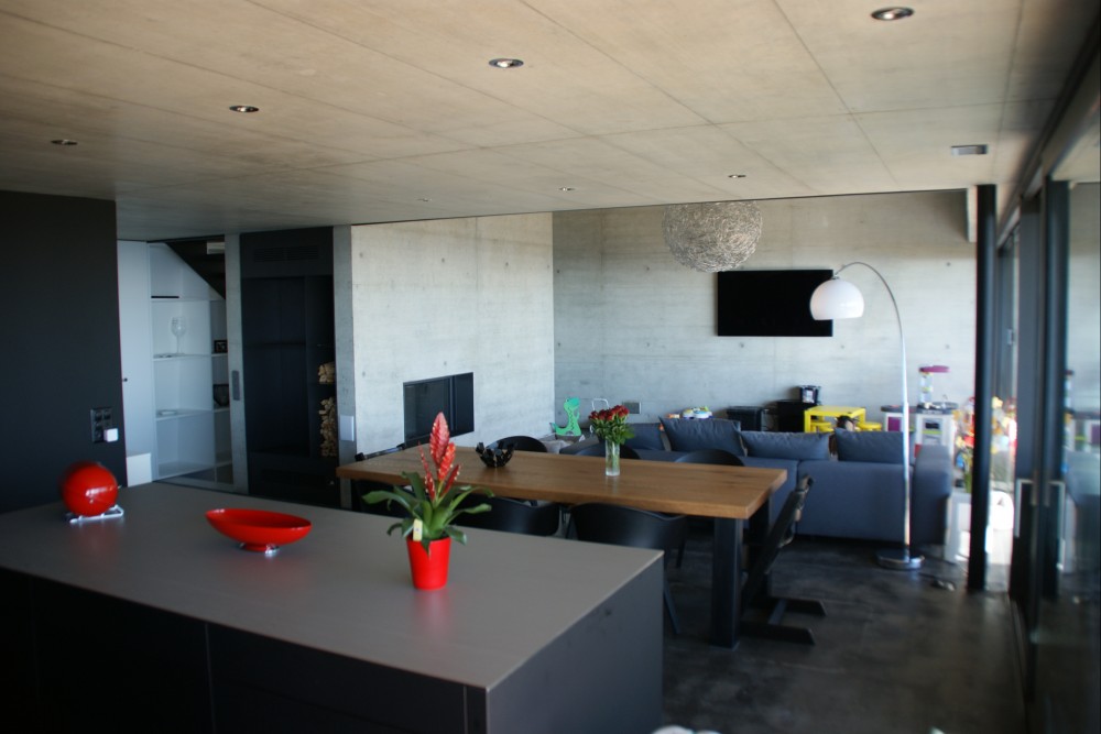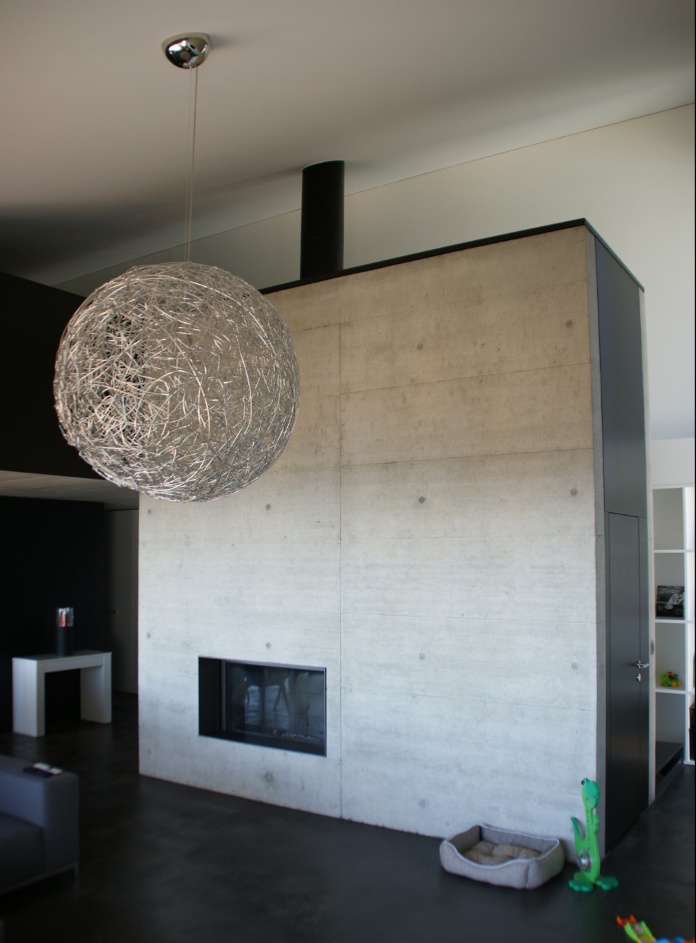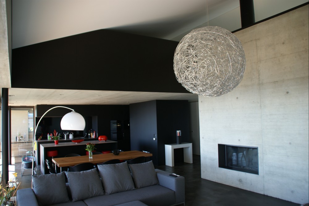 les accès se font par le nord au niveau supérieur, côté route, par un grand couvert d'accueil. la façade nord est traitée de manière totalement borgne dans le but de créer une coupure entre l'extérieur et l'intérieur. une fois entrée à l'intérieur de l'habitation, l'ouverture sur la vue est offerte et le dégagement est total. l'espace cuisine manger séjour est l'espace central de ce niveau, au milieu duquel viennent s'articuler une « boîte » cellier et se dresser un majestueux élément cheminée en béton visible. une double hauteur sur l'espace séjour amène une générosité supplémentaire à cet espace vie. un espace en mezzanine dans la pente du toit ainsi qu'un grand local de rangement sont accessibles depuis l'arrière de l'élément cheminée.