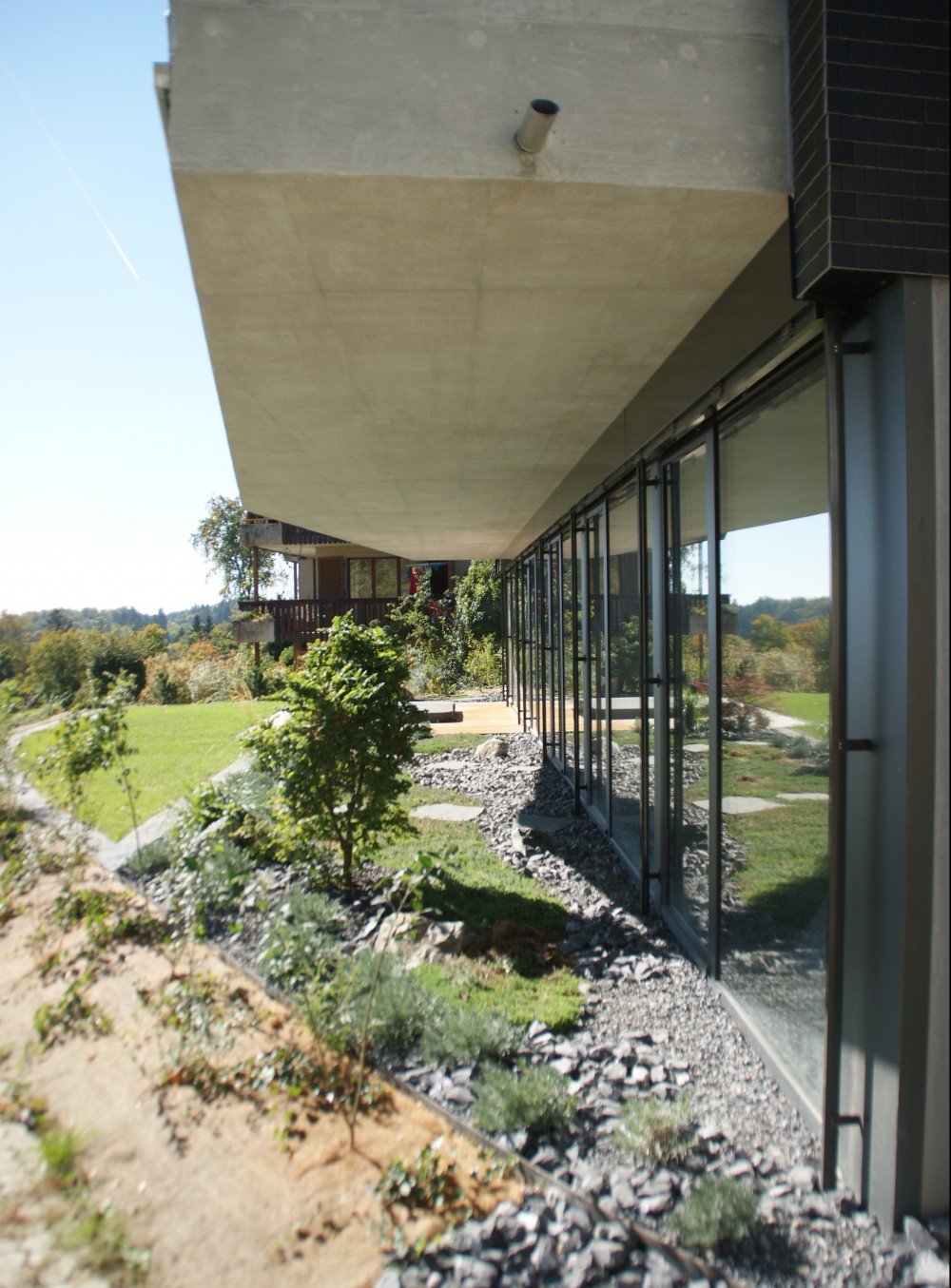 de par la pente du terrain, l'étage inférieur est également totalement ouvert sur l'avant et profite de la vue et d'une grande surface engazonnée à plein pied. ce niveau compte les zones parents et enfants, avec leurs salles de bain et dressings respectifs, alors que dans la partie arrière enterrée se trouvent les locaux techniques et de rangements usuels tels que buanderie, chaufferie et cave.