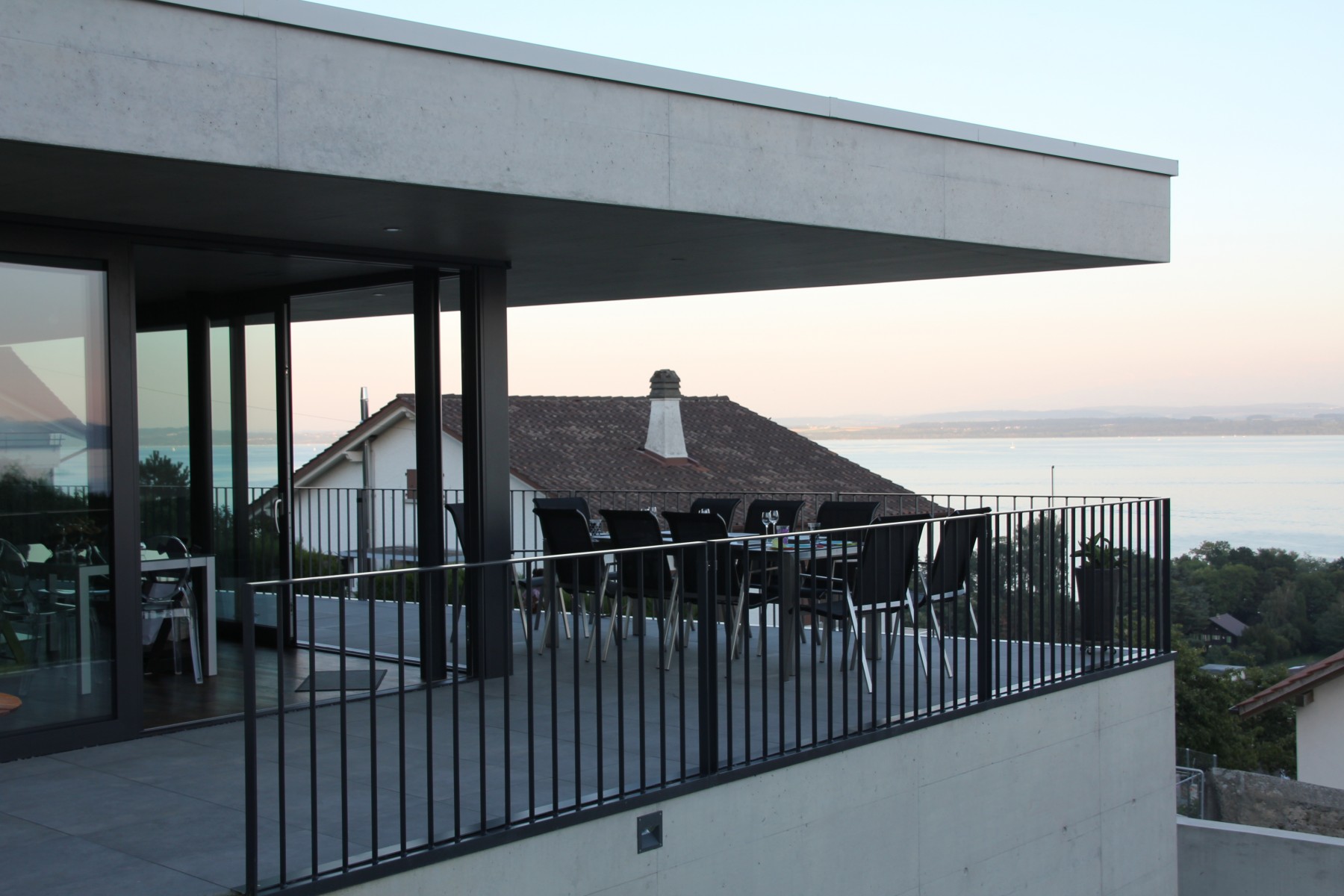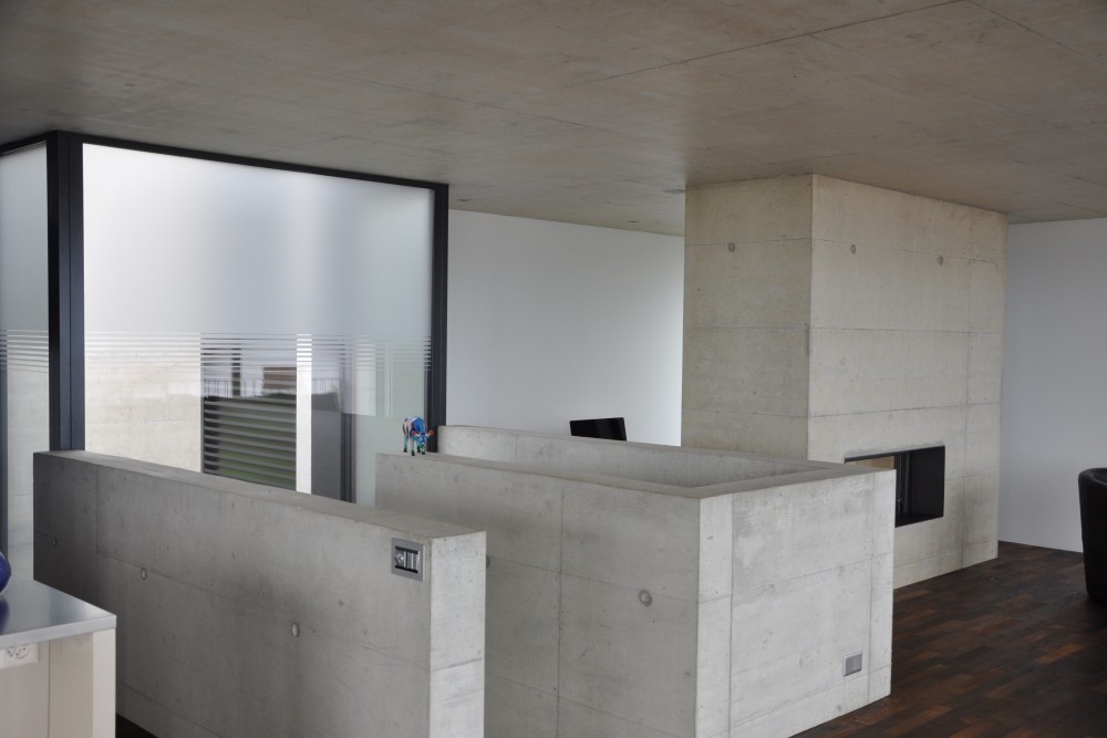 l'étage vie est totalement ouvert sur le sud et sur l'ouest. c'est un grand espace type « loft » avec séjour, cheminée et coin bureau, espace cuisine et manger, cellier et wc de service. le tout est dynamisé par la diagonale de la baie vitrée sud et la diagonale opposée de la grande toiture en porte-à-faux de la terrasse. cet espace est en lien direct avec le grand balcon extérieur qui s'enroule autour de la maison pour amener au jardin supérieur. de cet espace on embrasse largement tout l'environnement magnifique.