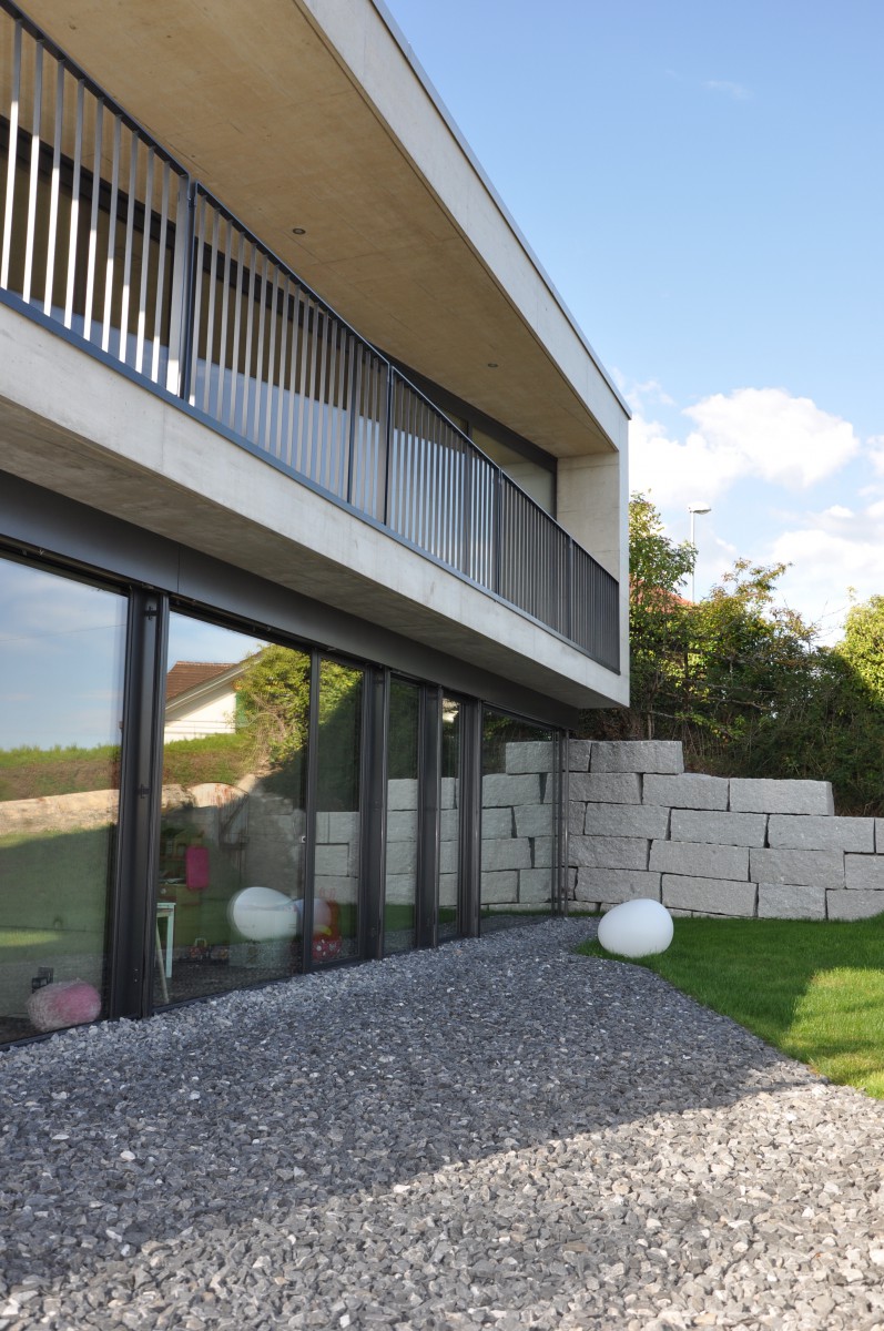 la villa est traitée en jeu de volumes et de porte-à-faux relativement monolithique en béton naturel, avec toute la menuiserie métallique et la serrurerie de couleur anthracite. à l'intérieur le béton domine sur les murs et les plafonds tandis que le bois du chêne fumé des sols apporte la chaleur nécessaire aux espaces de vie et de nuit.