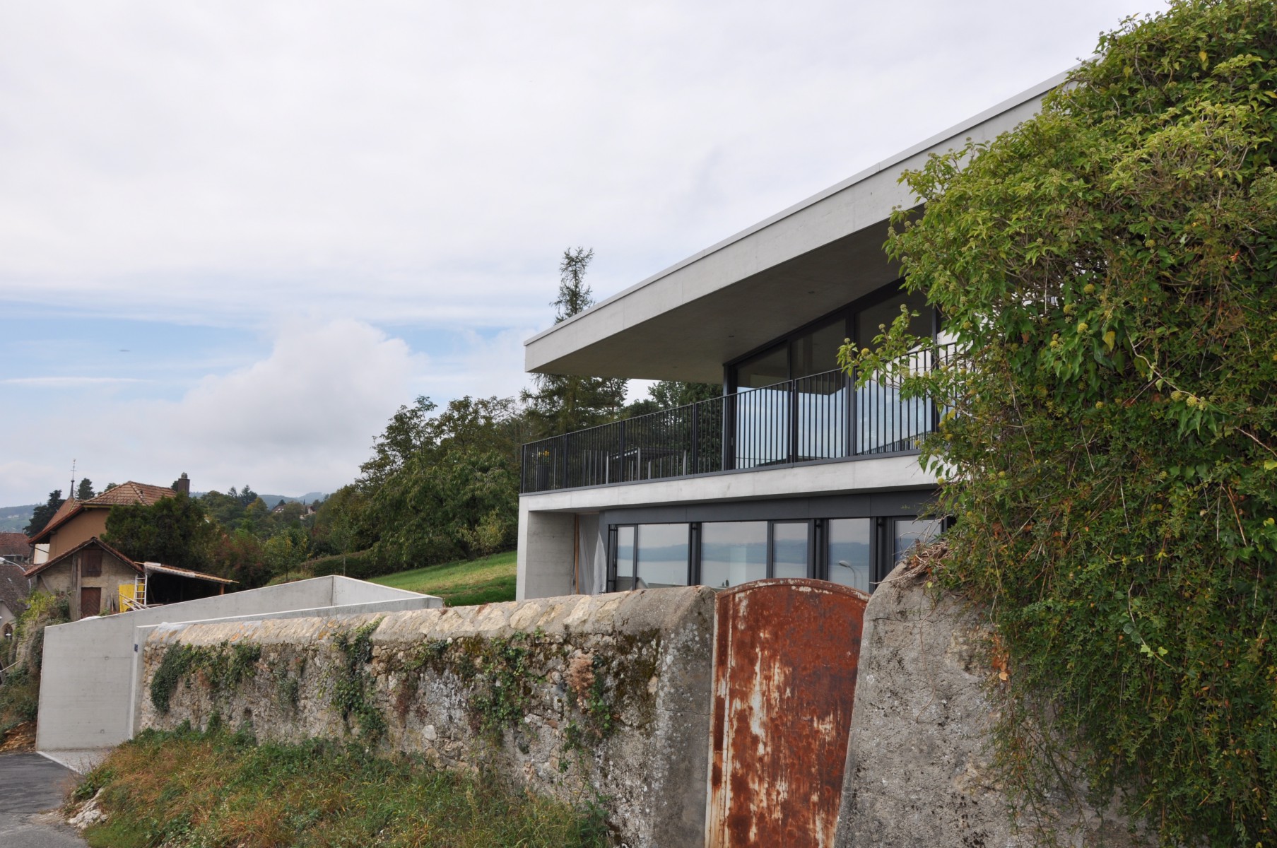 la parcelle a été particulièrement difficile à construire en regard de la législation en vigueur qui a mis des barrières parfois inutiles, puisque réelles uniquement dans la théorie mais invisibles dans les faits d'un volume construit et grandement enterré, mais également en regard des nombreuses servitudes et intransigeances du propriétaire situé en amont qui a vendu ce qui était le verger de sa maison.