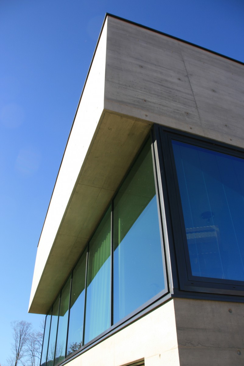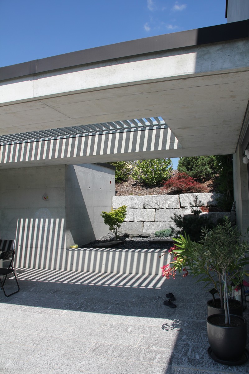 totalement extravertie sur son environnement dès qu'on accède aux espaces de vie ou aux chambres, la maison est introvertie par rapport à son voisinage direct de par son positionnement dans le terrain et sa conception, assurant l'intimité dans toutes les zones habitables comme dans le jardin aménagé.