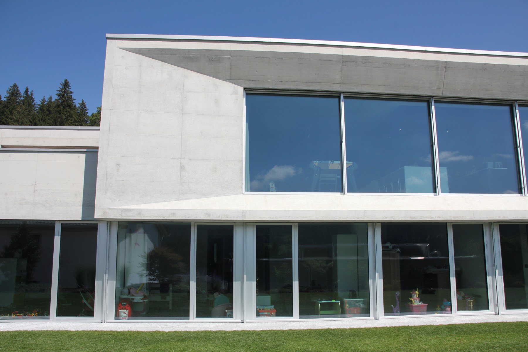dans les hauteurs du village de tramelan, à l'extrémité est du village dans une nouvelle zone de construction, la parcelle retenue par le maître d'ouvrage domine le nouveau quartier de villas et profite du dégagement est sur la campagne avec une magnifique vue en enfilade des montagnes et vallées de la région. au sud, le dégagement est grandement ouvert sur le paysage environnant, la montagne et les éoliennes du parc éoliens de mont-soleil. les villas construites en contrebas sont de faibles hauteurs et ne prétéritent pas la vue. côté ouest et soleil couchant, le positionnement de la terrasse et les aménagements extérieurs tiennent comptent de la villa voisine relativement proche mais dont l'impact a été géré de manière douce et sans perte de qualité et d'intimité.