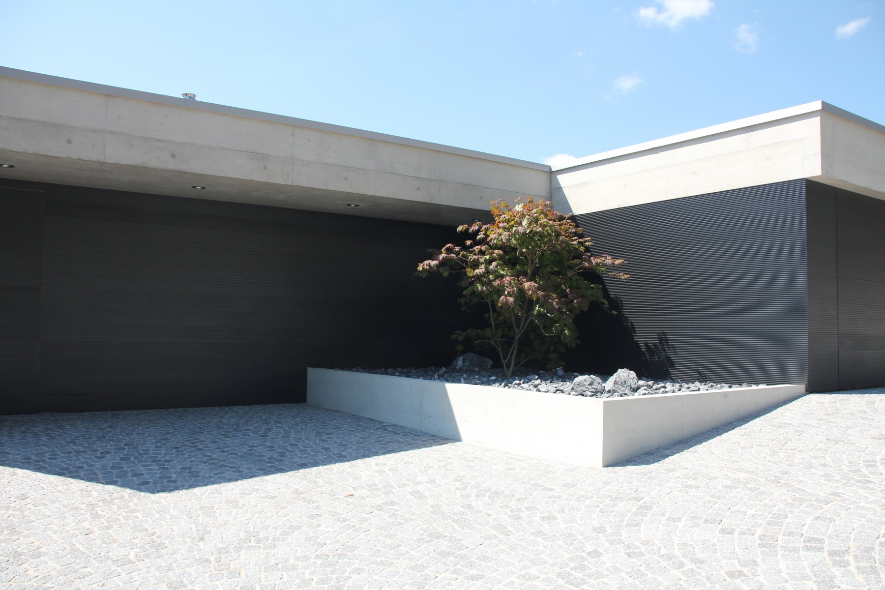 une grande unité et une grande sobriété règnent dans toute la villa. l'aluminium naturel des vitrages, le béton brut des murs et des plafonds, les sols en béton ciré de couleur gris chaud et toutes les parties verticales en menuiserie de chêne fumé brut de sciage confèrent à l'ensemble une harmonie totale. le grand mur en ardoise de la terrasse se prolonge à l'intérieur dans le bureau et lie ainsi l'espace de vie extérieur à l'espace de vie intérieur. à l'extérieur, le béton visible, l'aluminium eloxé naturel, l'ardoise et la façade nord anthracite confère à cet écrin sérénité et sobriété.
